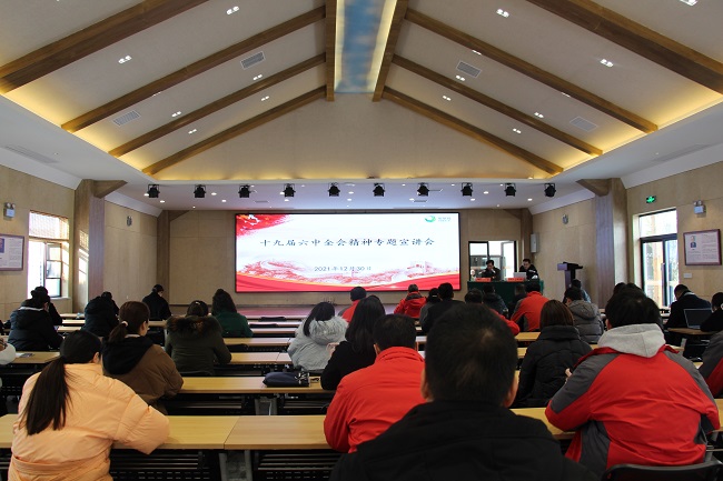 12月30日上午,咸寧集團(tuán)在蘿卜公社鄉(xiāng)村振興大講堂舉辦學(xué)習(xí)貫徹黨的十九屆六中全會(huì)精神專題宣講會(huì),邀請(qǐng)咸寧市委黨校十九屆六中全會(huì)精神宣講團(tuán)成員、市委黨校副教授解全勝作宣講報(bào)告。集團(tuán)黨總支書(shū)記、董事長(zhǎng)王忠主持會(huì)議并講話。集團(tuán)全體黨員及入黨積極分子、集團(tuán)本部主管及以上員工、各子公司部分員工代表約100余人參加宣講會(huì)。